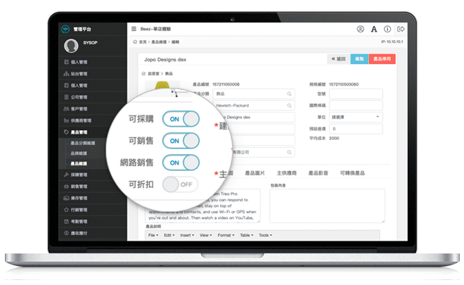 商品的所有狀態只需一鍵即可設定(採購/銷售/預購/折扣....)。