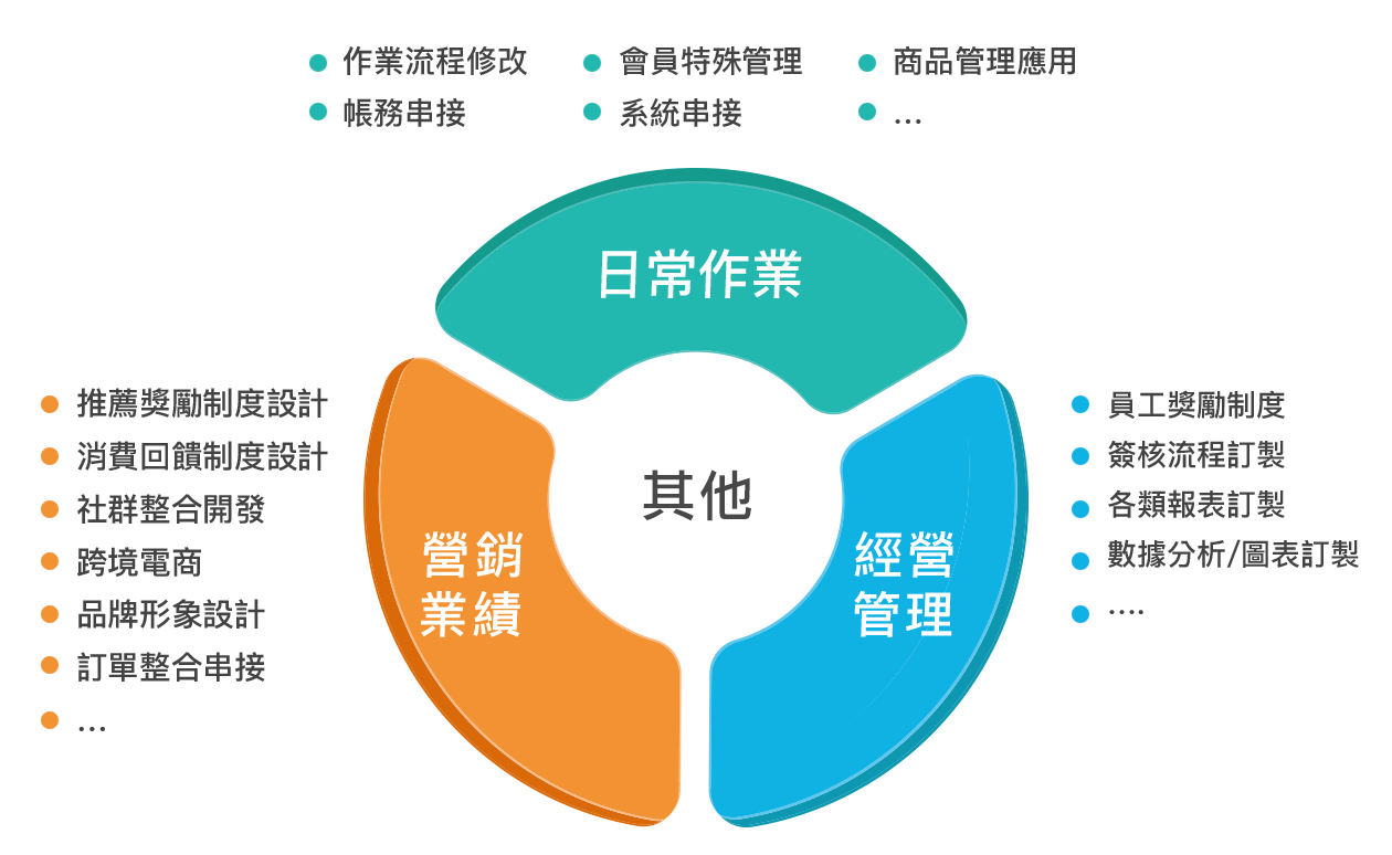 更甚者,如需專業顧問導入服務或是專案系統開發或系統串接等服務,我們亦可滿足需求。